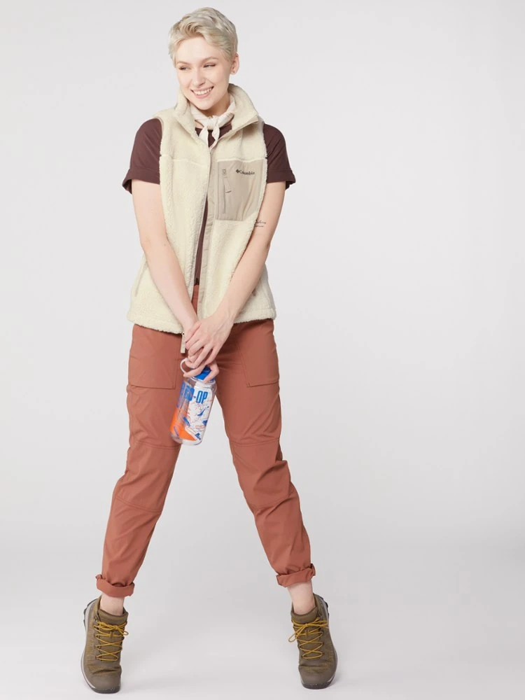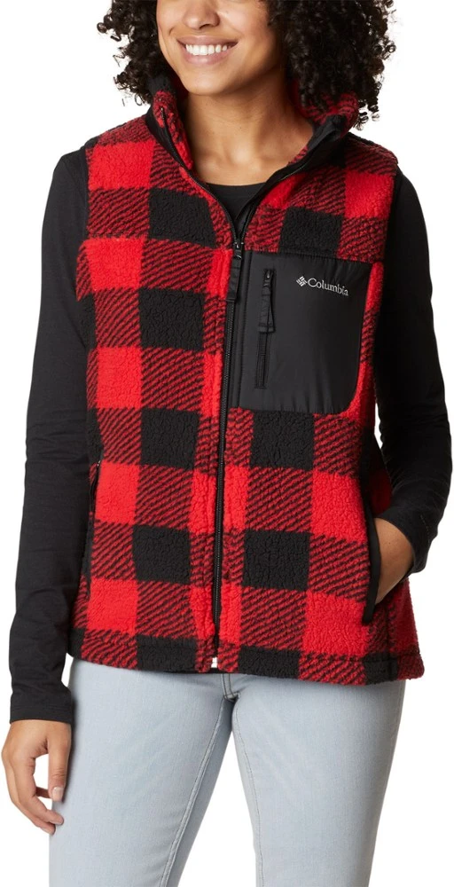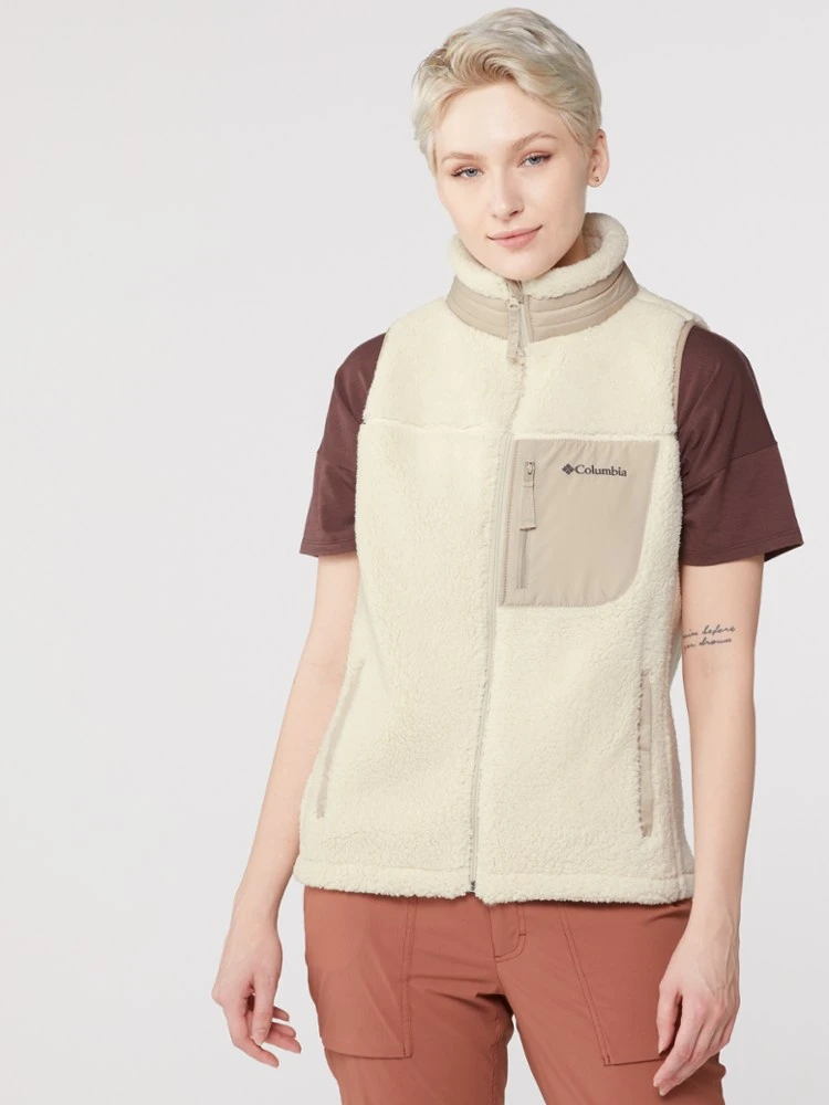 Made from a plush faux fur with a water- and- stain-repellent overlay, this soft and warm Columbia West Bend women’s vest is just the cozy boost you need on chilly days.